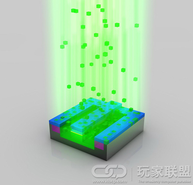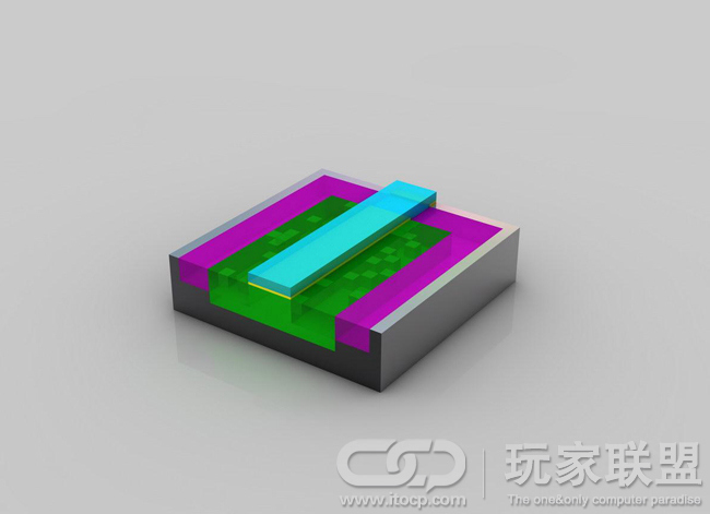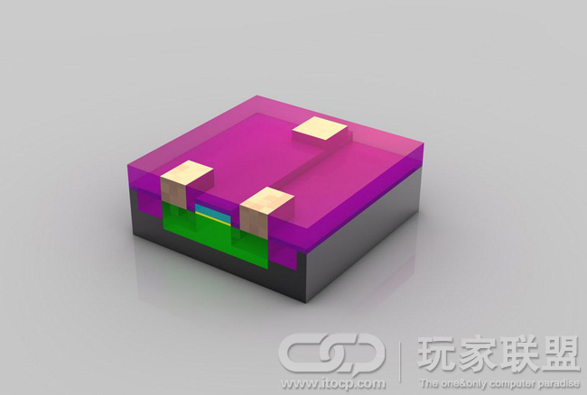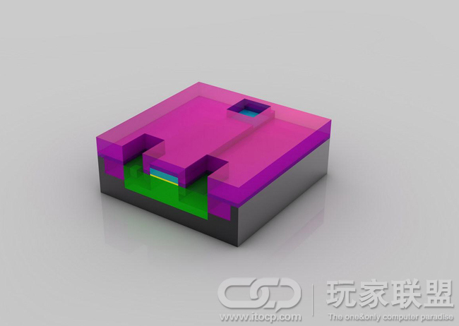 晶體管就緒:至此,晶體管已經(jīng)基本完成。在絕緣材(品紅色)上蝕刻出三個孔洞,并填充銅,以便和其它晶體管互連。
